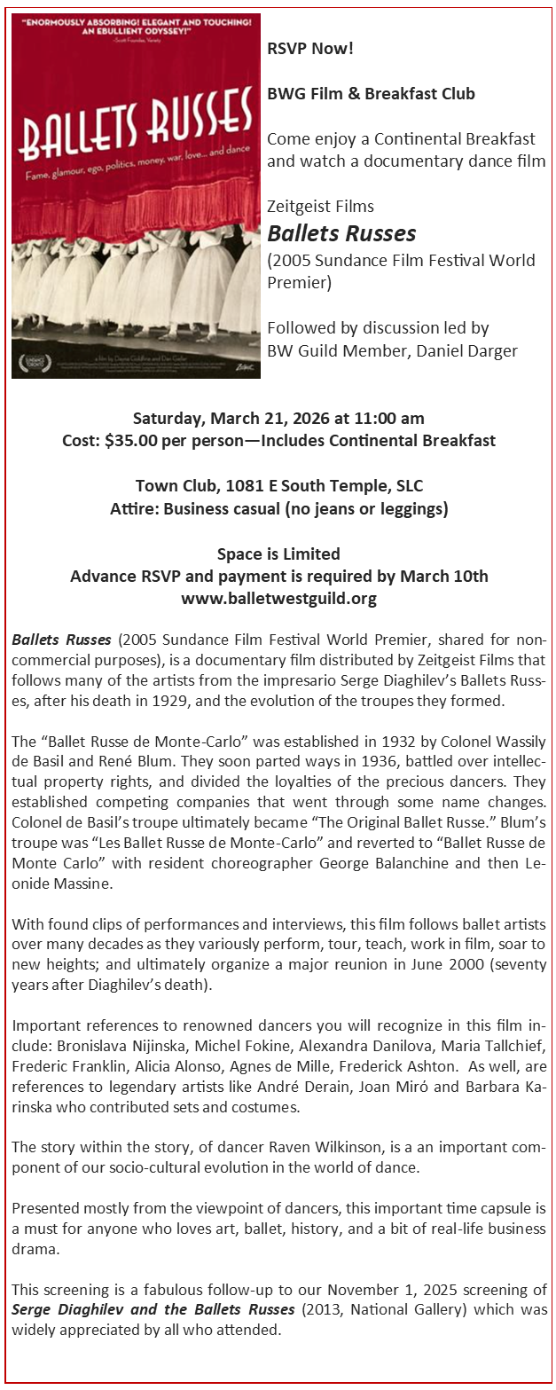 The Film & Breakfast Club ~ March 21, 2026 The Film & Breakfast Club ~ March 21, 2026 BalletWestGuild Click HERE to RSVP Click HERE to RSVP BalletWestGuild Categories:Ballet West Guild Tags:b, Ballets Russes, film club 0 Comments 0 Likes